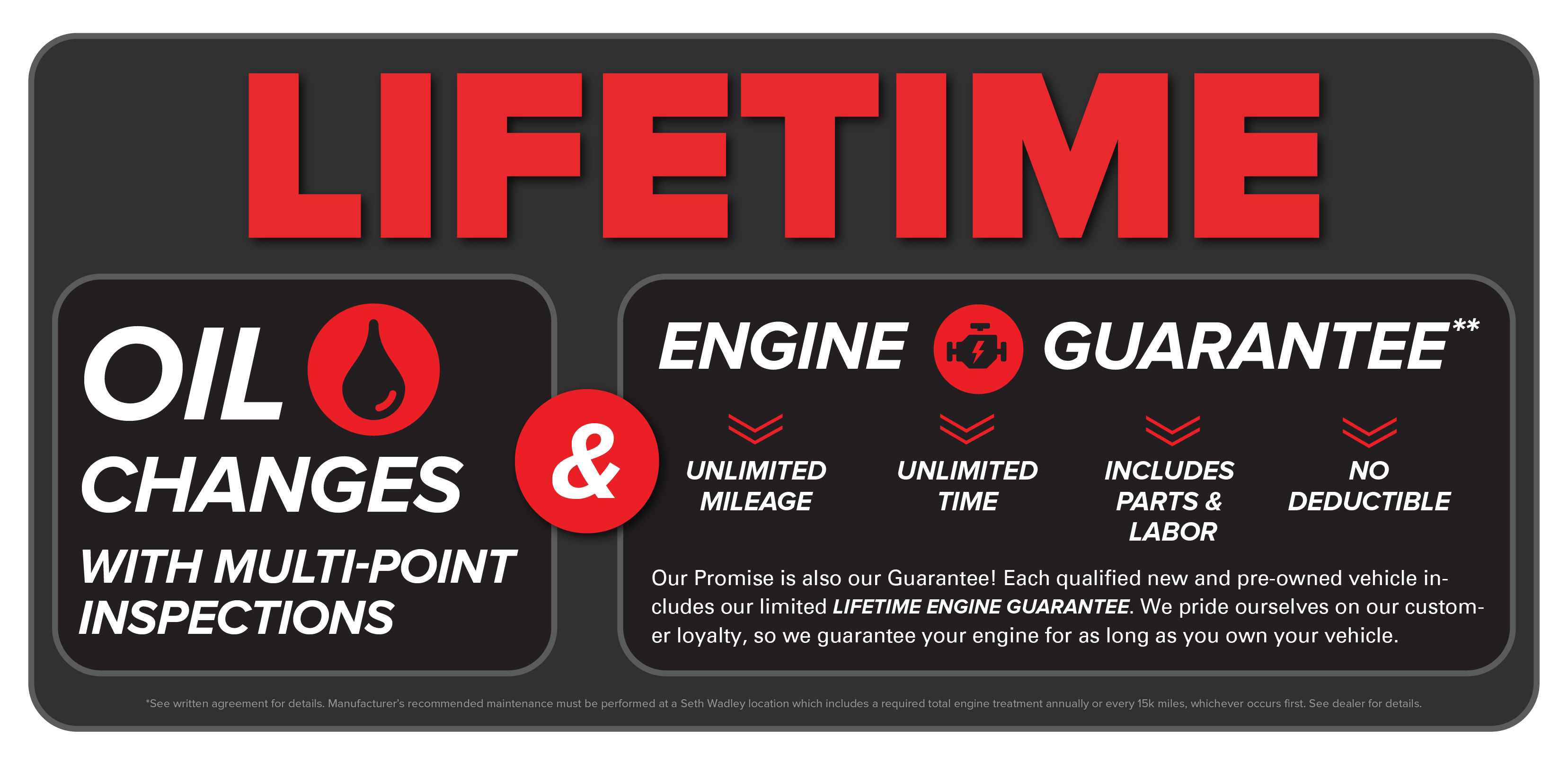 We work hard to make sure that our customers have a fantastic experience pre and post-purchase. For that reason, we put our money where our mouth is with our Oil Changes and Engines for Life Program. The counter above is a live feed of our total amount spent on customers to date.